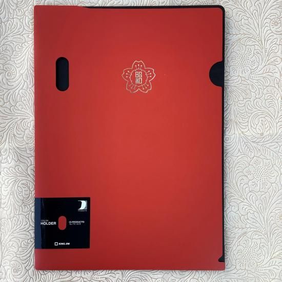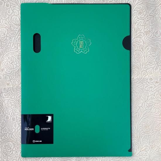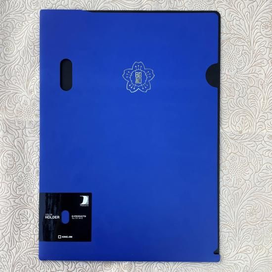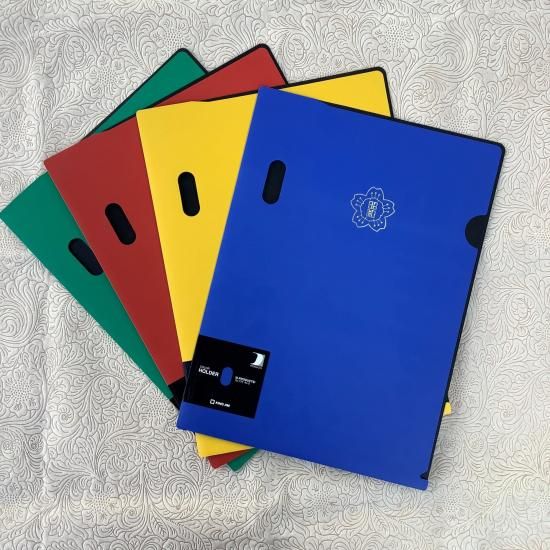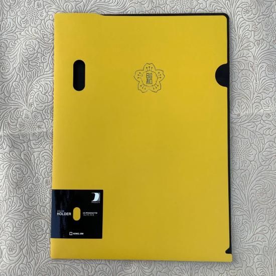 ビビットなカラーホルダーに銀色の箔で大学の校章を箔押しました。シンプルで飽きのこないデザインで、書類の出し入れのしやすさを追求した定番の一品です。中が透けないので、書類の内容が外から分からず安心です。