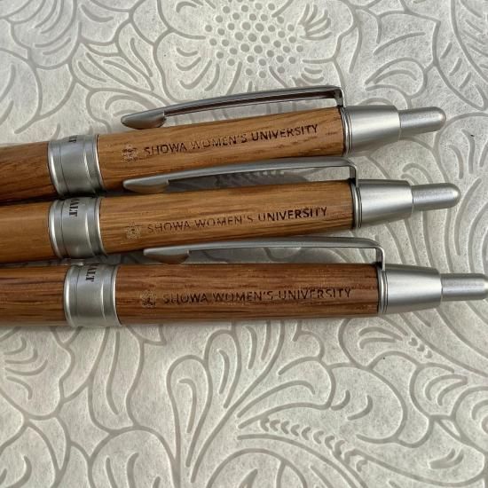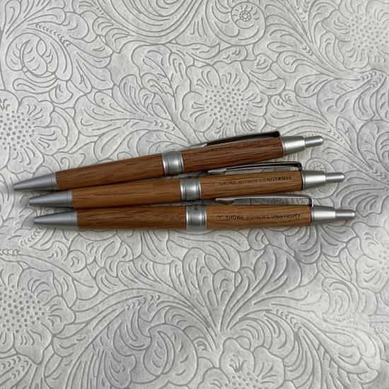 一本一本、全て違うペン軸に大学の校章と校名を英字でレーザー刻印しました。